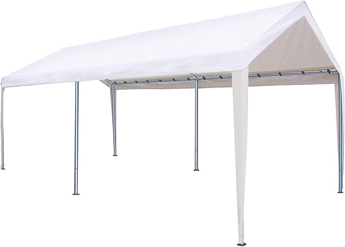 This heavy-duty carport is perfect for leaving up throughout the year. It measures 10 ft W x 20 ft L and comes in white or beige. The frame is galvanized steel, measuring 1.5 inches in diameter with thickened connectors that measure 1.65 inches. The galvanized finish helps protect the frame from rust, corrosion, peeling, and chipping. The canopy fabric is extra thick polyethylene, measuring 180 grams and is waterproof, tear-resistant, and anti-UV. A unique feature of this carport is the windproof edge cover with an extended 10-inch flap that protects your vehicle from water getting under the canopy and getting your vehicle wet. A leg cloth and adjustable hook cover each pole.